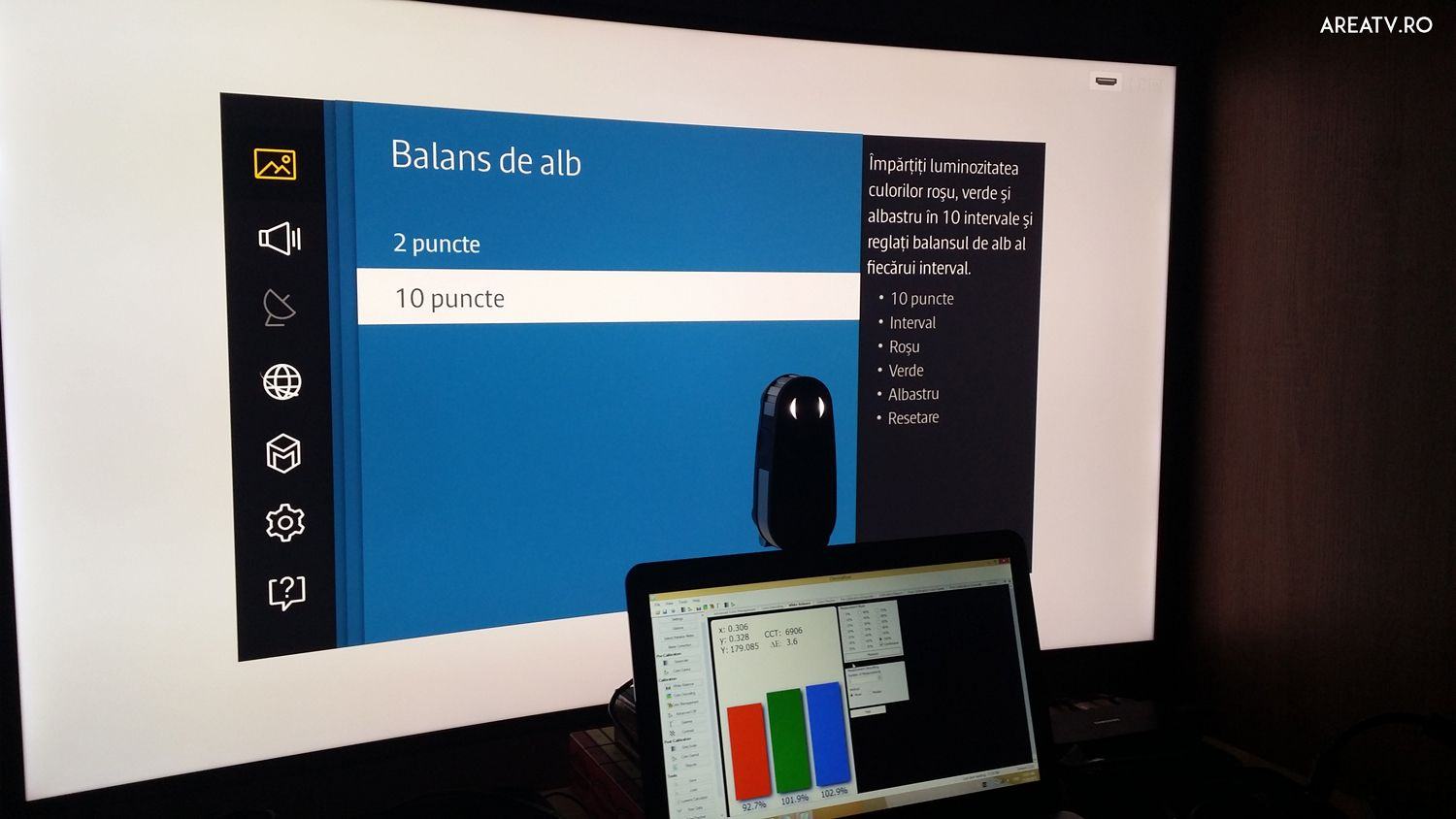 De fapt, nu s-a calibrat nimic fiind un placebo banal, calibrarea presupune masuratori electro-optice cu instrumente certificate care sunt la randul lor calibrate si ulterior verificate pentru a fi standardizate http://www.chromapure.com/products-i1pro-d3_professional.asp (nu iti iei ochelarii de vedere de pe raft din hipermarket, in prealabil se fac niste masuratori in functie de care se aplica corectiile pentru a aduce vederea in standard) Semnalul video generat (tripletii RGB) este aidoma celui din laborator (mult mai precis ca cel generat de un banal blu-ray sau PC) http://www.chromapure.com/products-murideo.asp Softurile profesionale sunt folosite la scara larga in Broadcast, Production, si Post precum in medicina si media http://calman.spectracal.com/