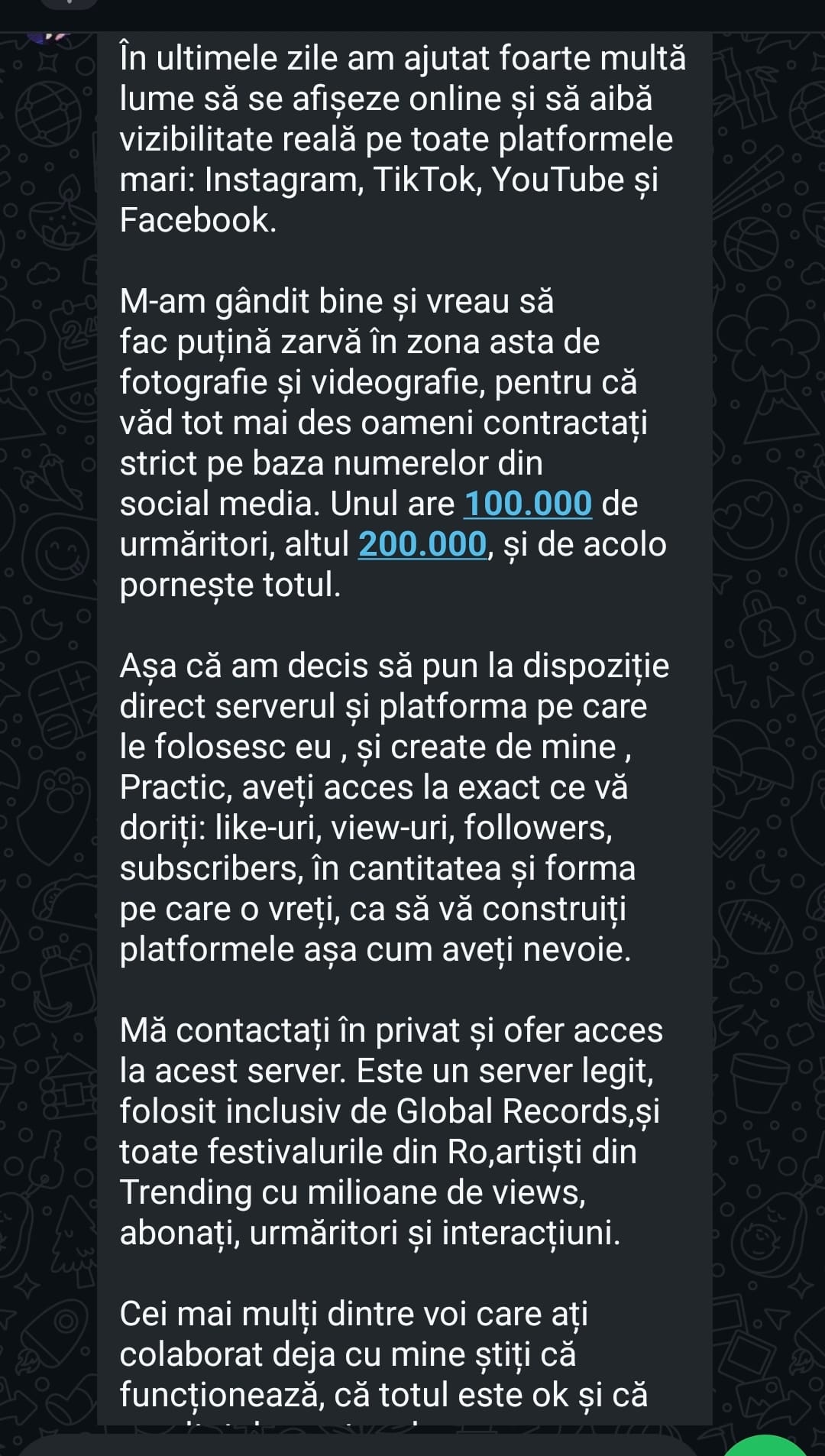 Toată treaba asta am pornit-o acum câteva zile, când pe un grup de foto un băiat a venit să vândă o poveste. Știți cum e în marketing, un sâmbure de adevăr există. N-ai cum să zici o poveste fără să fie și ceva adevărat p-acolo. Sigur, continuarea și demascarea omului au fost amuzante. Că doar lucrează la Global Records, nu? (discuția e mai lungă decât cea din screenshot, însă au fost și multe audio p-acolo)